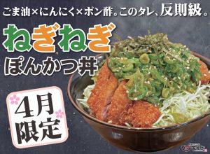 4月の期間限定かつ丼は「ねぎねぎぽんかつ丼」! 食欲そそるにんにくとごま油の香りに、あっさりとした酸味をポン酢でプラスし、カットしたねぎを和えて食感をプラス!食べたら分かる、美味しいやつ!!😋 トッピングに「ねぎダレ大盛…続きを読む
